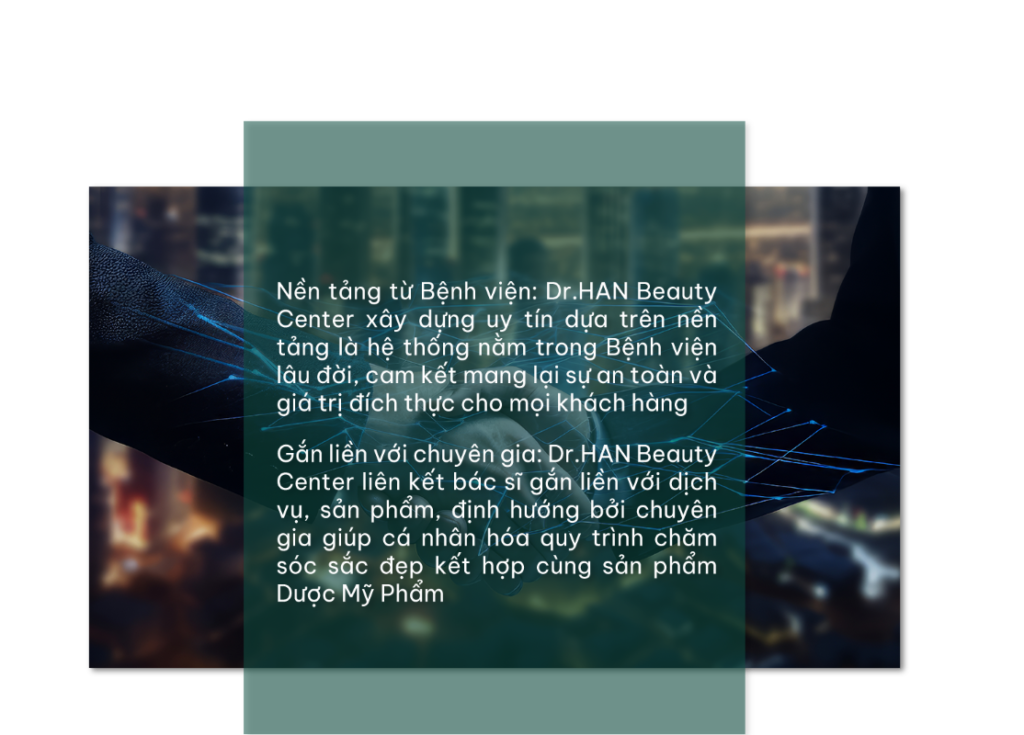 Hơn 13 năm có mặt trên thị trường, Dr.HAN Beauty Center nắm giữ sứ mệnh giữ gìn và tôn vinh vẻ đẹp Việt, giúp khách hàng bảo tồn nhan sắc thông minh bền vững. Khác với mô hình trung tâm làm đẹp truyền thống, Dr.HAN Beauty Center là một phần trong hệ thống bệnh viện có chiều dài phát triển lâu đời. Chính vì thế, chúng tôi ứng dụng trọn vẹn kiến thức y khoa và cơ sở khoa học vào tất cả sản phẩm – dịch vụ – quy trình dưới sự thực hiện và giám sát từ bác sĩ, mang tới giá trị thật nhất cho khách hàng.